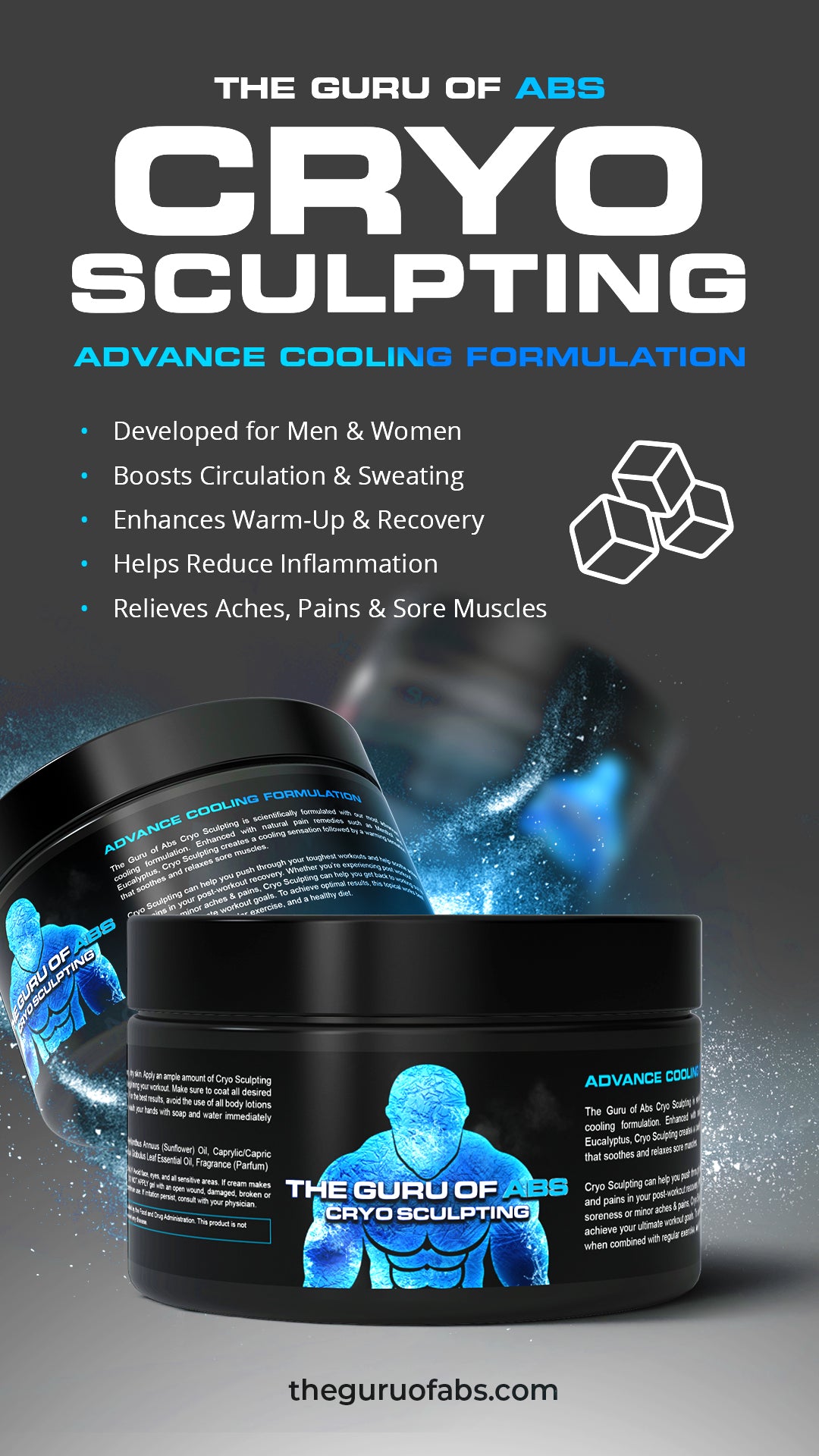 The Guru of Abs Cryo Sculpting Gel is scientifically formulated with our most advanced cooling formulation. Enhanced with natural pain remedies such as Menthol and Eucalyptus, Cryo Sculpting creates a cooling sensation followed by a warming sensation that soothes and relaxes sore muscles.